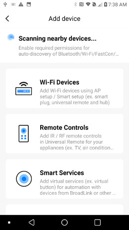Picture 2: The Broadlink app will automatically start the Smart Scan system and look for the RM 4 Pro emitter (and other devices it is programmed to recognize on your local WiFi network, such as a Roku remote).